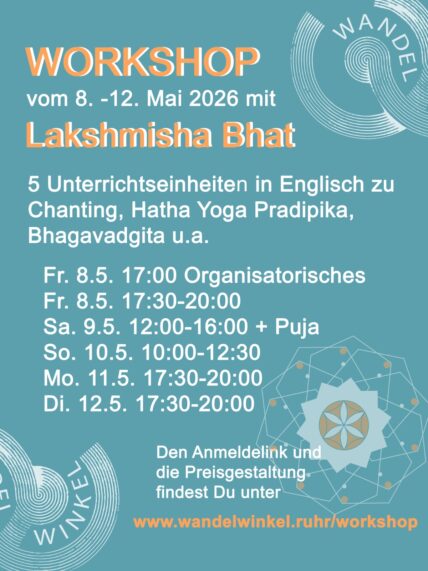 2025 war Lakshmisha Bhat das erste Mal für einen Workshop im Wandelwinkel und in der Zeit vom 8. - 12. Mai 2026 wird er uns wieder besuchen. Der englischsprachige Workshop (einfaches Schulenglisch ausreichend) teilt sich in fünf Einheiten und beinhaltet jeweils Hatha Yoga Pradipika Kapitel 2, Bhagavadgita und Chanting.
